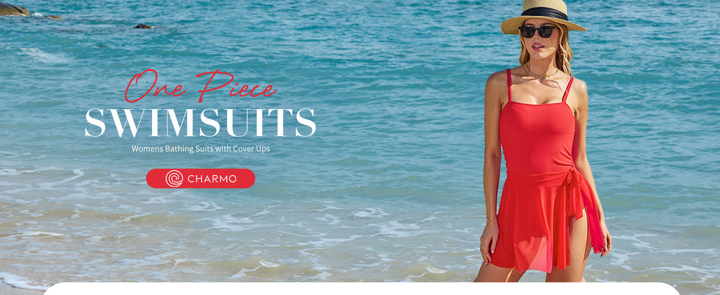 Charmo Women's Tummy Control Swimdress V Neck Scalloped Tie Back Cut Out Bathing Suit with Skirt