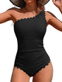 Asoul Ribbed One Piece Swimsuit for Women One Shoulder Scalloped Bathing Suits Tummy Control Swim Suit Monokini Swimwear - Black / S is backordered and will ship as soon as it is back in stock.