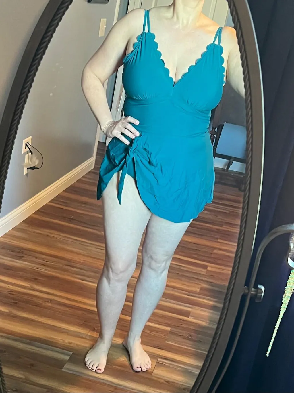 The elegant V-neckline and playful scalloped edges create a flattering silhouette, while the cut-out design adds a daring touch. The tie-back ensures a custom fit, offering both comfort and style. Perfect for making a splash at the beach or lounging poolside with effortless charm!