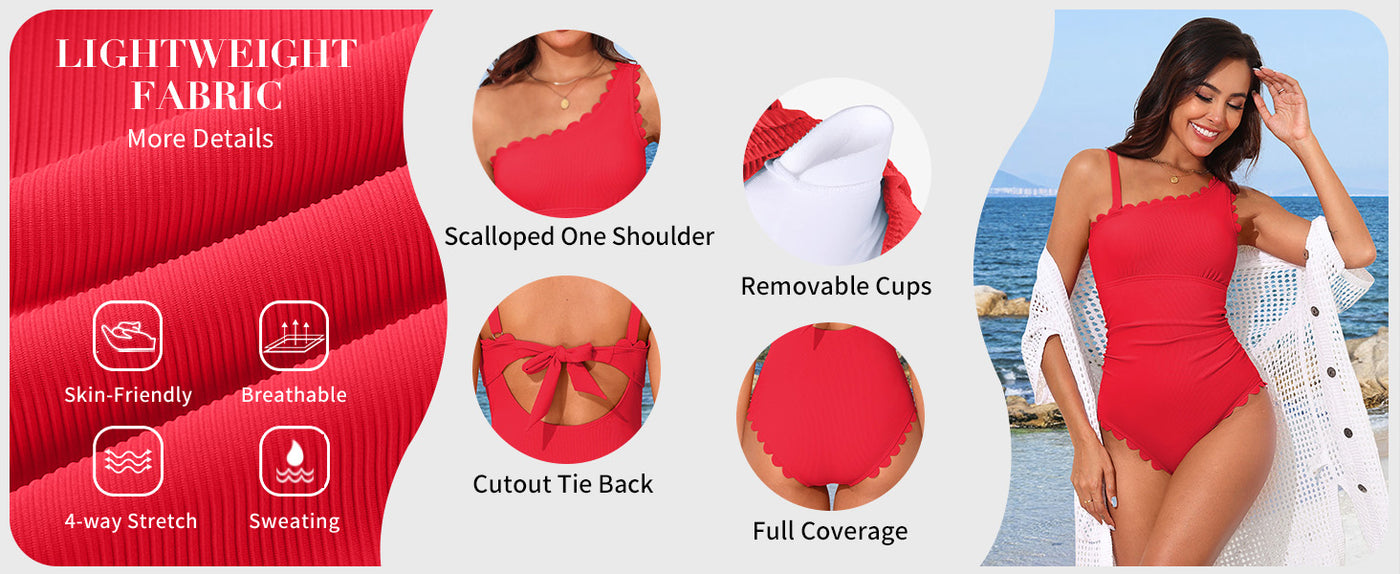 Ribbed Swimsuit: Removable and adjustable straps, one shoudler, scalloped details, cutout back, removeable pads, ruched desigan for tummy control,full coverage for beach and pool activites, high waisted for slimming in visual, swim suit creats a stylish summer vibes