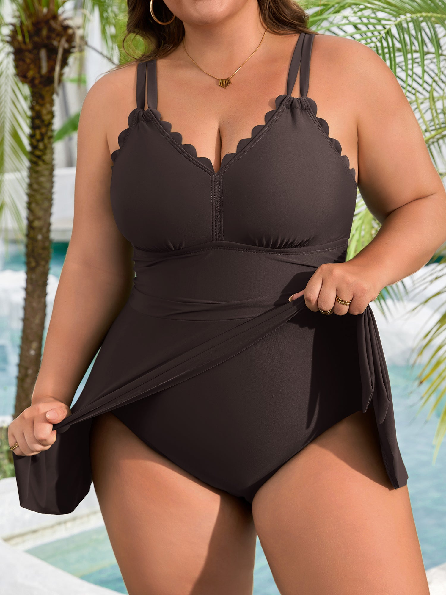 Asoul V Neck Tie Side Scalloped Tummy Control Plus Size Swimdress